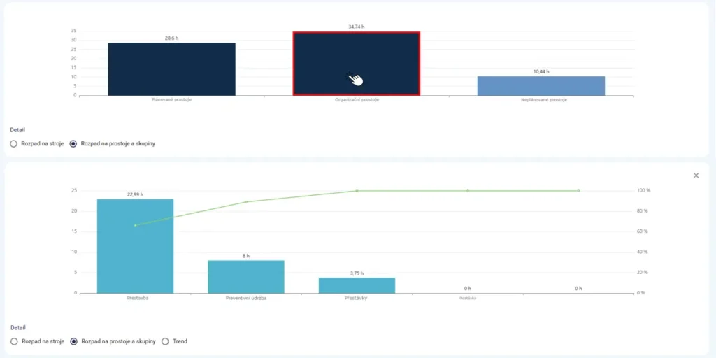 - identifikovat dopad neplánovaných prostojů a neidentifikovaných ztrát, rozkliknout detail až na úroveň skupin i konkrétních příčin,