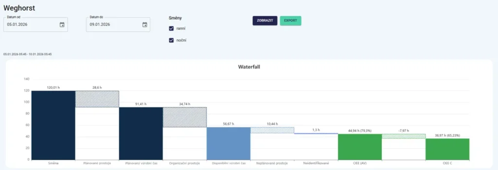 Do BI Control jsme přidali nový Waterfall přehled, který přehledně ukazuje, jak se celkový směnový fond postupně promítá do výsledného OEE. Díky tomuto pohledu můžete snadno identifikovat jednotlivé vlivy a přesně určit, kde vznikají ztráty.