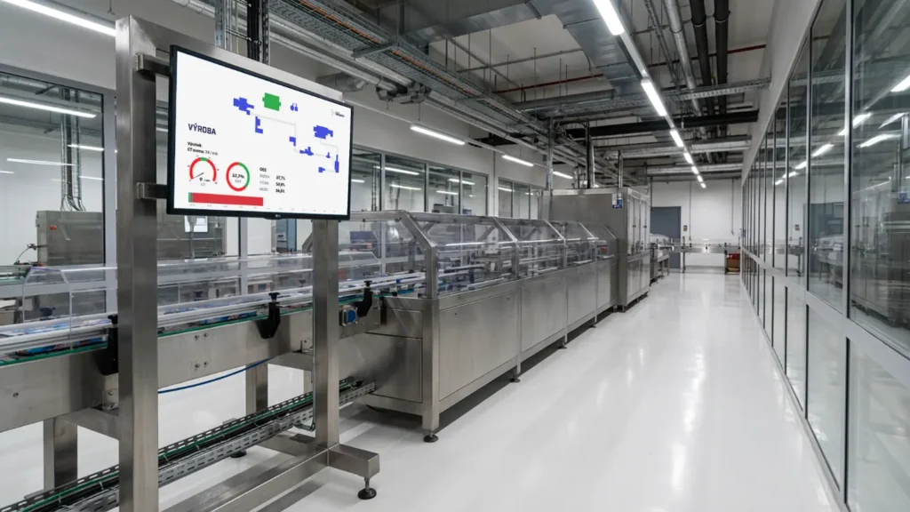 Poslední možností je vizualizace primární výrobních linek i vč. zobrazení toku materiálu a např. přiřazení hodnot jako je rychlost, tak, cyklus. Tento typ zobrazení je velice dynamický a vytváří pocit reálného toku.